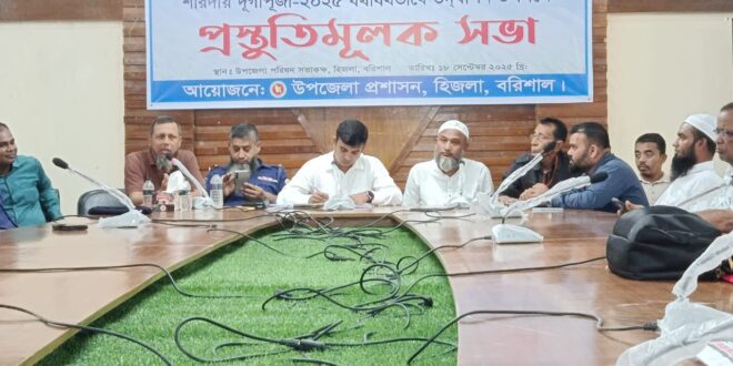 হিজলায় উপজেলা প্রশাসনের উদ্যোগে আসন্ন শারদীয় দুর্গাপূজা শান্তিপূর্ণ ও উৎসবমুখর পরিবেশে উদযাপন নিশ্চিতকরণে করণীয় বিষয়ে প্রস্তুতিমূলক সভা অনুষ্ঠিত হয়েছে।
