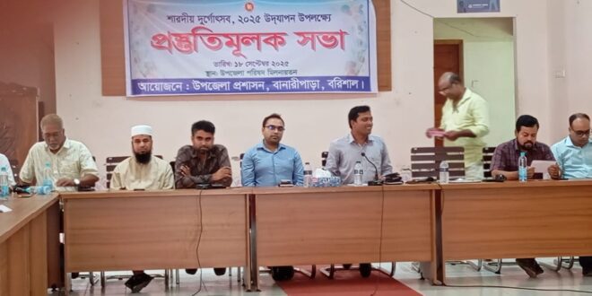 ১৮সেপ্টেম্বর, বৃহস্পতিবার সকাল ১১টায় বানারীপাড়া উপজেলা অডিটোরিয়ামে উপজেলা নির্বাহী কর্মকর্তা মো: বায়েজিদুর রহমানের সভাপতিত্বে প্রস্ততি সভায় অন্যান্যদের মধ্যে বক্তব্য রাখেন উপজেলা সহকারী কমিশনার(ভূমি) জি,এম,এ মুনীব,উপজেলা স্বাস্থ্য ও পরিবার পরিকল্পনা কর্মকর্তা মো: ফখরুল ইসলাম মৃধা, উপজেলা কৃষি কর্মকর্তা মোঃ মাহফুজুর রহমান, থানা অফিসার ইনচার্জ (ওসি) মোঃ মোস্তফা, বানারীপাড়া উপজেলা বিএনপির সভাপতি মোঃ শাহ আলম মিঞা,সহ-সভাপতি গোলাম মাহমুদ মাহবুব মাস্টার, সাধারণ সম্পাদক রিয়াজ আহমেদ মৃধা, পৌর বিএনপি সম্পাদক হাবিবুর রহমান জুয়েল, উপজেলা জামায়াতে ইসলামী’র সেক্রেটারি হাফেজ মোকাম্মেল হোসেন মোজাম্মেল, উপজেলা যুবদলের সভাপতি সাব্বির আহমেদ সুমন হাওলাদার,উপজেলা স্বেচ্ছাসেবক দলের সভাপতি মোহাম্মদ সাইদুল ইসলাম, পৌর জামায়াতে ইসলামী”র সভাপতি মোঃ কাওছার হোসেন, উপজেলা ইসলামী শাসনতন্ত্র আন্দোলনের সভাপতি মাওলানা মোঃ শিহাব উদ্দিন, বানারীপাড়া পূজা উদযাপন পরিষদের পরিষদের সভাপতি দেবাশীষ রায়, সাধারণ সম্পাদক গৌতম সমাদ্দার, বানারীপাড়া সার্বজনীন হরিসভা মন্দিরের সভাপতি উজ্জ্বল কুন্ডু, সাধারণ সম্পাদক বিটু দাস, বানারপাড়া খ্রিস্টান ঐক্য ফ্রন্টের সহ-সভাপতি কমল মাষ্টার, সাংবাদিক সাব্বির হোসেন বিভিন্ন মন্দির কমিটির সভাপতি ও সাধারণ সম্পাদক বৃন্দ। সভায় দূর্গাপূজা উদযাপনের জন্য উপজেলার বিভিন্ন এলাকার স্থাপিত ৫৭টি মন্দিরের সভাপতি এবং সাধারণ সম্পাদক বৃন্দ উপস্থিত ছিলেন।