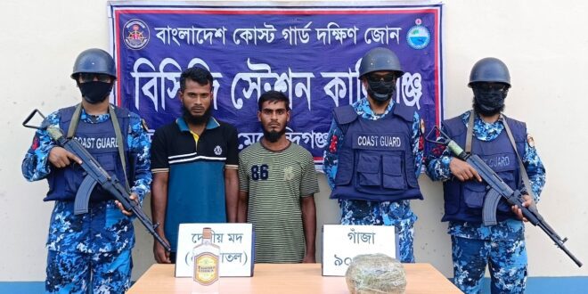 জানা যায় গোপন সংবাদের ভিত্তিতে বুধবার সকাল ৫টার দিকে কোষ্টগার্ড কালীগঞ্জ জোনের একটি টিম উলানিয়া বাজার সংলগ্ন এলাকায় বিশেষ অভিযান চালায়।তখন প্রায় ১কেজি গাজা ও ১বোতল দেশীয় মদ সহ দুজন মাদক ব্যবসায়ীকে আটক করে।