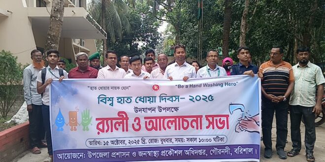 “হাত ধোয়ার নায়ক হোন” ও “Be a Hand Washing Hero” এই প্রতিপাদ্যকে সামনে রেখে বরিশালের গৌরনদী উপজেলায় বুধবার (১৫ অক্টোবর) যথাযথ গুরুত্বের সাথে পালিত হলো বিশ্ব হাত ধোয়া দিবস ২০২৫। দিবসটি উপলক্ষে উপজেলা প্রশাসন ও জনস্বাস্থ্য প্রকৌশল অধিদপ্তরের যৌথ উদ্যোগে এক বর্ণাঢ্য র্যালি ও আলোচনা সভা অনুষ্ঠিত হয়েছে।