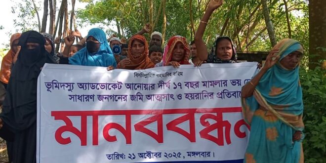 মানববন্ধনে অংশগ্রহণকারীরা প্রশাসনের কাছে দ্রুত তদন্ত করে ভূমিদস্যু অ্যাডভোকেট আনোয়ার হোসেনের বিরুদ্ধে কঠোর আইনগত ব্যবস্থা নেওয়ার জোর দাবি জানান।