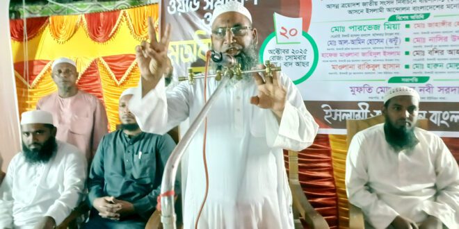 সোমবার সন্ধ্যায় গৈলা মডেল ইউনিয়ন পরিষদের ৫নং ওয়ার্ড সুজনকাঠী সমাজ কল্যান সংসদ’র সামনে ইসলামী আন্দোলন বাংলাদেশ গৈলা ইউনিয়ন শাখার সভাপতি মুফতি মো. নুর নবী সরদারের সভাপতিত্বে ওয়ার্ড সমাবেশ ও মতবিনিময় সভায় প্রধান অতিথি হিসেবে বক্তব্য রাখেন, বরিশাল-১ আসনের ইসলামী আন্দোলন বাংলাদেশের (হাতপাখা)’র প্রার্থী রাসেল সরদার মেহেদী।