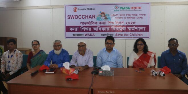 নিজস্ব প্রতিবেদক : জাতিসংঘ ঘোষিত আন্তর্জাতিক কন্যাশিশু দিবস উপলক্ষে বরিশালে কন্যাশিশু অধিকার বিষয়ক কর্মশালা অনুষ্ঠিত হয়েছে। বৃহস্পতিবার (১১ অক্টোবর) সকালে উন্নয়ন সংস্থা ওয়াদা’র আয়োজনে এবং সেভ দ্য চিলড্রেন ইন্টারন্যাশনাল এর সহযোগিতায় নগরীর বিডিএস ক্লাব সভাকক্ষে এ কর্মশালা হয়।