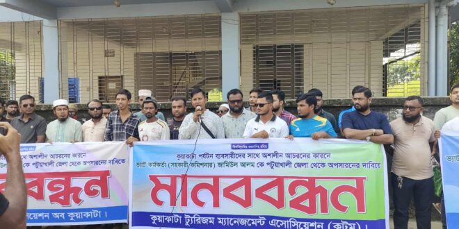 কুয়াকাটা পর্যটন ব্যবসায়ীদের সঙ্গে অশালীন আচরণের অভিযোগে পটুয়াখালী কাস্টমস, এক্সাইজ ও ভ্যাট বিভাগের সহকারী কমিশনার (ভ্যাট কর্মকর্তা) জামিউল আলমের অপসারণের দাবিতে মানববন্ধন করেছে স্থানীয় ব্যবসায়ীরা।