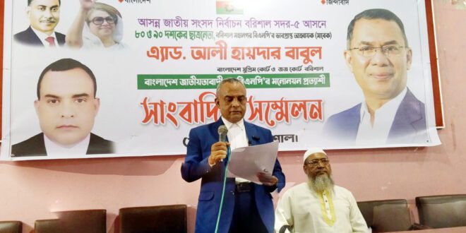 আসন্ন জাতীয় সংসদ নির্বাচনে বরিশাল সদর-৫ আসনে বিএনপির মনোনয়ন প্রত্যাশী হিসেবে সংবাদ সম্মেলন করেছেন মহানগর বিএনপির সাবেক আহ্বায়ক আইনজীবী এ্যাডভোকেট আলী হায়দার বাবুল। রোববার বেলা সাড়ে ১১টায় বরিশাল প্রেসক্লাব হলরুমে ওই সংবাদ সম্মেলন অনুষ্ঠিত হয়।