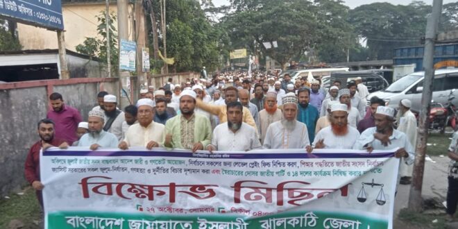 জুলাই সনদের আইনী ভিত্তি ও দ্রুত বাস্তবায়ন এবং পিআর পদ্ধতিতে নির্বাচনসহ ৫দফা দাবিতে পৃথকভাবে বিক্ষোভ সমাবেশ ও মিছিল করেছে বাংলাদেশ জামায়াতে ইসলামী ও ইসলামী আন্দোলন বাংলাদেশ ঝালকাঠি জেলা শাখা।