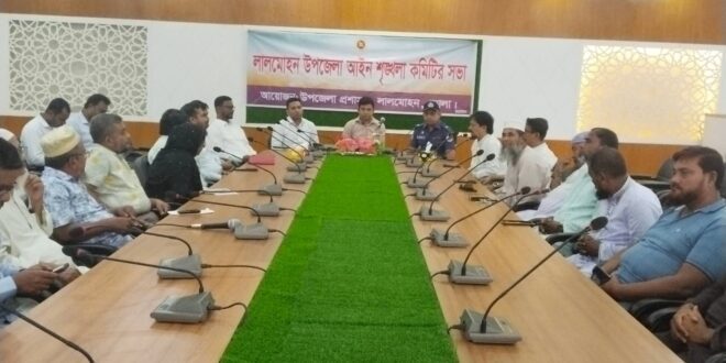 ভোলার লালমোহন উপজেলায় মাসিক আইনশৃঙ্খলা কমিটির সভা অনুষ্ঠিত হয়েছে। মঙ্গলবার দুপুরে উপজেলা প্রশাসনের আয়োজনে উপজেলা পরিষদ হলরুমে এ সভা অনুষ্ঠিত হয়। এতে সভাপতিত্ব করেন উপজেলা নির্বাহী কর্মকর্তা (ইউএনও) মো. শাহ আজিজ।