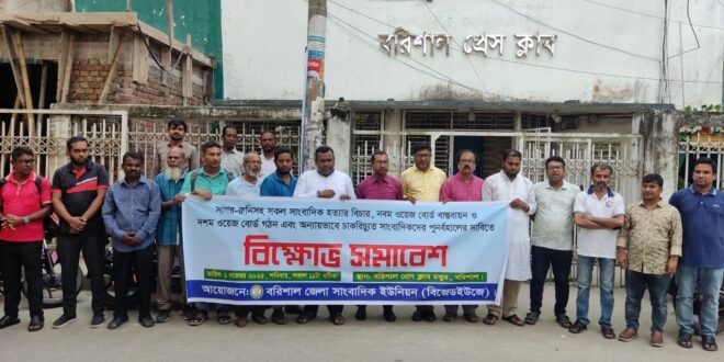 সাগর-রুনিসহ সকল সাংবাদিক হত্যার বিচার, নবম ওয়েজ বোর্ড বাস্তবায়ন ও দশম ওয়েজ বোর্ড গঠন এবং অন্যায়ভাবে চাকরিচ্যুত সাংবাদিকদের পুনর্বহালের দাবিতে বরিশালে বিক্ষোভ সমাবেশ অনুষ্ঠিত হয়েছে।