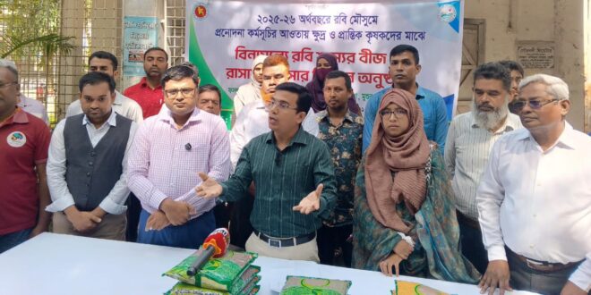 বরিশালের গৌরনদী উপজেলা কৃষি অফিসের উদ্যোগে ২০২৫-২৬ অর্থবছরের রবি মৌসুম উপলক্ষে ক্ষুদ্র ও প্রান্তিক কৃষকদের মাঝে বিনামূল্যে রবি শস্যের বীজ ও রাসায়নিক সার বিতরণ করা হয়েছে।