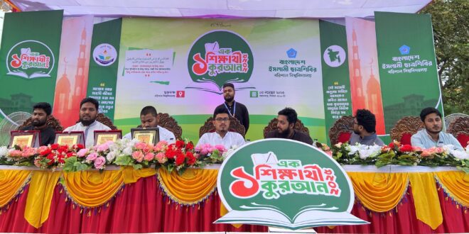 “এক শিক্ষার্থী এক কোরআন” স্লোগানে বরিশাল বিশ্ববিদ্যালয় (ববি) শাখা ছাত্রশিবির সাধারণ শিক্ষার্থীদের মাঝে ২ হাজার কপি আল কোরআন বিতরণ করেছে। অনুষ্ঠানে প্রধান অতিথি হিসেবে উপস্থিত ছিলেন ঢাকা বিশ্ববিদ্যালয় কেন্দ্রীয় ছাত্র সংসদের (ডাকসু) সহ-সভাপতি (ভিপি) সাদিক কায়েম।