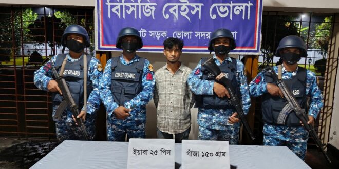 গোপন তথ্যের ভিত্তিতে আজ ৬ নভেম্বর ২০২৫ তারিখ বৃহস্পতিবার মধ্যরাত ১ টায় কোস্ট গার্ড বেইস ভোলা কর্তৃক ভোলা সদরের কুঞ্জপট্টি ভেলুমিয়া বাজার সংলগ্ন এলাকায় একটি বিশেষ অভিযান পরিচালনা করা হয়। অভিযান চলাকালীন উক্ত এলাকায় সন্দেহজনক ১ জন ব্যক্তিকে তল্লাশি করত প্রায় ১২ হাজার ৫ শত টাকা মূল্যের ২৫ পিস ইয়াবা ও ৪ হাজার ৫ শত টাকা মূল্যের ১৫০ গ্রাম গাঁজাসহ আটক করা হয়।
