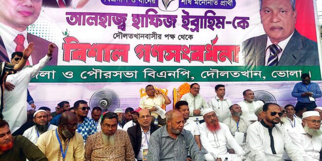 জহিরুল ইসলাম জহির এর সঞ্চালনায় ফারুক হোসেন তালুকদার এর সভাপতিত্বে ১২নভেম্বর (বুধবার ), বিকাল ৩টায় দৌলতখানে জাতীয় সংসদ নির্বাচনে বিএনপি ও ধানের শীষের মনোনীত প্রার্থীর প্রতি ভালোবাসা, সমর্থন ও প্রত্যাশার এক অনন্য প্রকাশ ঘটল দৌলতখানে। স্থানীয় বিএনপি এবং অঙ্গসহযোগী সংগঠনের উদ্যোগে দলীয় প্রার্থীকে দেওয়া হল এক বর্ণাঢ্য ও বিশাল গণসংবর্ধনা।