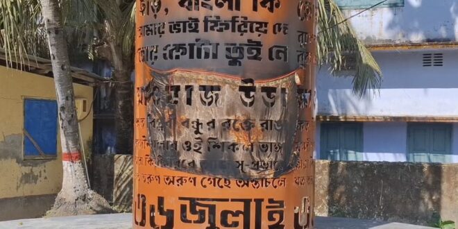 পিরোজপুরে জুলাই স্মৃতিস্তম্ভে দুর্বৃত্তদের অগ্নিসংযোগের ঘটনা ঘটেছে। শুক্রবার গভীর রাতের কোনো এক সময় অজ্ঞাতপরিচয় ব্যক্তিরা স্মৃতিস্তম্ভে আগুন ধরিয়ে দেয় বলে ধারণা করছে পুলিশ। শনিবার বেলা ১১টার দিকে স্থানীয়রা স্মৃতিস্তম্ভ থেকে ধোঁয়া ও পোড়া চিহ্ন দেখতে পেয়ে পুলিশকে খবর দেয়।