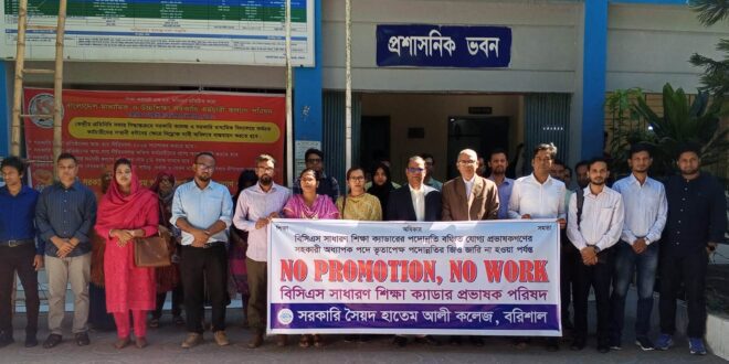 বিসিএস সাধারণ শিক্ষা ক্যাডারের প্রভাষকদের সহকারী অধ্যাপক পদে পদোন্নতির জিও (গেজেট) প্রকাশ না হওয়ায় ও দাবি আদায়ের লক্ষ্যে বরিশালে সরকারি সৈয়দ হাতেম আলী কলেজে আন্দোলন কর্মসূচি পালিত হয়েছে।