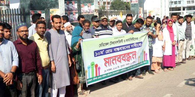বরিশালে জেলা সম্মিলত মেডিকেল টেকনোলজিস্ট ও ফার্মাসিস্টবৃন্দের আয়োজনে আজ বুধবার (১৯ নভেম্বর) দুপুর ২টায় বরিশাল শের-ই-বাংলা মেডিকেল কলেজ হাসপাতালের সামনে এই মানববন্ধন কর্মসূচী পালন করে তারা।