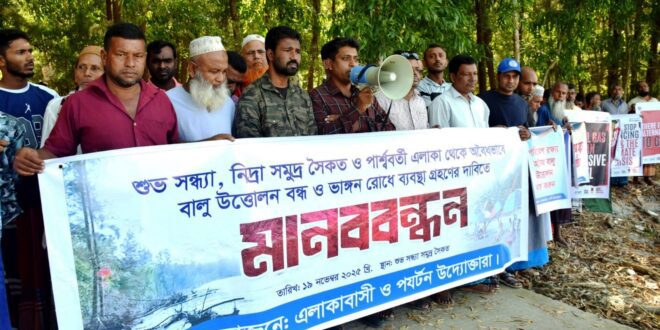 বরগুনার তালতলী শুভ সন্ধ্যা ও নিদ্রা সৈকত এলাকা থেকে অবৈধ ভাবে বালু উত্তোলন বন্ধ ও সমুদ্র সৈকত ভাঙ্গনের হাত থেকে রক্ষার জন্য ঘন্টাব্যাপী এক মানববন্ধন কর্মসূচী পালন করেছে এলাকাবাসী।