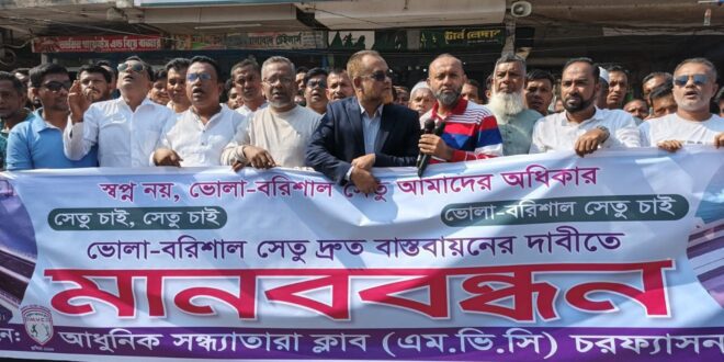 ভোলা–বরিশাল সেতু নির্মাণের দাবিতে ভোলার চরফ্যাশনে মানববন্ধন ও স্মারকলিপি প্রদান করা হয়েছে।