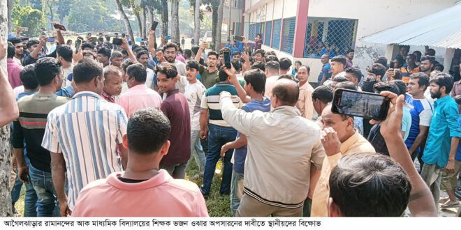 বরিশালের আগৈলঝাড়ায় এক শিক্ষকের বিরুদ্ধে শ্লীলতাহানীর অভিযোগ উঠেছে। তিন দিনের মধ্যে ব্যবস্থা নিতে ওই বিদ্যালয়ের ৫১ জন শিক্ষার্থী অভিভাবকরা প্রধান শিক্ষকের কাছে লিখিত অভিযোগ দিয়েছে। অভিযুক্ত শিক্ষকের অপসারনের দাবীতে স্থানীয় অভিভাবকদের বিক্ষোভ মিছিল। পুলিশ ঘটনাস্থলে গিয়ে পরিস্থিতি নিয়স্ত্রন করেন।