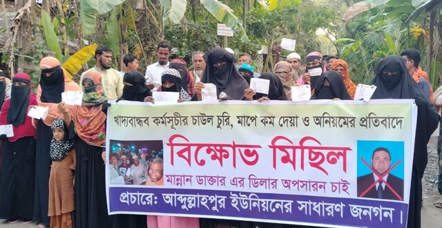 বিক্ষোভ মিছিলে ইউনিয়নের খাদ্যবান্ধব কর্মসূচীর চালের কার্ডধারী হতদরিদ্র প্রায় অর্ধশত নারী-পুরুষ অংশগ্রহণ করে। এ সময় তারা অভিযুক্ত ডা. আবদুল মান্নানের খাদ্যবান্ধব কর্মসূচীর চালের ডিলারশীপ বাতিল ও তার শাস্তি দাবী করে শ্লোগান দেন।