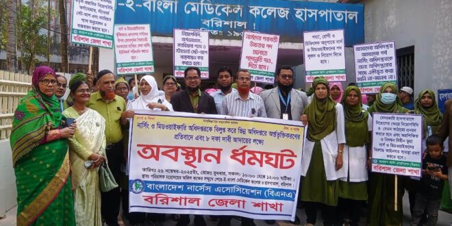 বরিশাল শের-ই-বাংলা মেডিকেল কলেজ হাসপাতালে ৮ দফা দাবিতে ঘণ্টাব্যাপী অবস্থান কর্মসূচি পালন করেছেন নার্সরা। বুধবার সকাল ১১টায় হাসপাতাল পরিচালকের কার্যালয়ের সামনে এই কর্মসূচি অনুষ্ঠিত হয়।