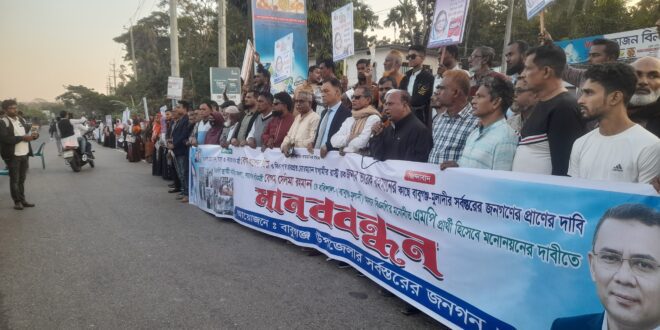 বরিশালের বাবুগঞ্জ উপজেলার সর্বস্তরের জনগণের উদ্যোগে আয়োজিত এই মানববন্ধনে এলাকার বিভিন্ন স্তরের নাগরিক, স্থানীয় নেতাকর্মী ও সাধারণ মানুষ ব্যাপক অংশগ্রহণ করেন।