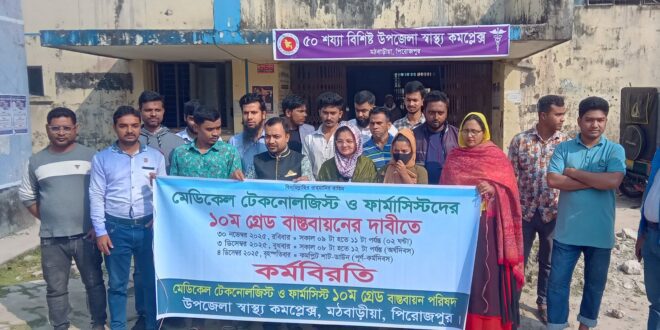 পিরোজপুরের মঠবাড়িয়া আজ সকালে স্বাস্থ্য ও পরিবার কল্যাণ মন্ত্রণালয়ের অধীনস্থ সকল স্বাস্থ্য প্রতিষ্ঠানে কর্মরত মেডিকেল টেকনো লজিস্ট ও ডিপ্লোমা ফার্মাসিস্টদের ১১ তম গ্রেড হইতে দশম গ্রেডে উন্নীতকরণের দাবিতে কর্মসূচি পালিত হয়েছে। পূর্ব নির্ধারিত কর্মসূচি অনুযায়ী সকাল ৯টা থেকে ১১ টা পর্যন্ত ২ ঘন্টা কর্মবিরতি পালন করেন।