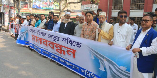 ভোলা- বরিশাল সেতু নির্মানের দাবিতে বরিশাল নগরীতে মানববন্ধন অনুষ্ঠিত হয়েছে।