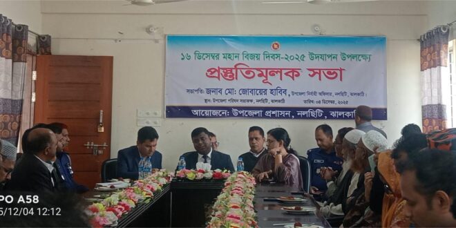 ঝালকাঠির নলছিটিতে আগামী ১৪ ডিসেম্বর শহিদ বুদ্ধিজীবী দিবস ও ১৬ ডিসেম্বর মহান বিজয় দিবস-২০২৫ উদ্যাপন উপলক্ষে এক প্রস্তুতিমূলক সভা অনুষ্ঠিত হয়েছে। বৃহস্পতিবার (৪ডিসেম্বর) উপজেলা পরিষদ সভাকক্ষে এ সভা অনুষ্ঠিত হয়।