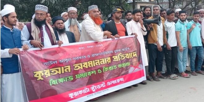 পবিত্র কুরআন অবমাননার প্রতিবাদে এবং বাউল শিল্পী আবুল সরকার ও ব্রাহ্মণবাড়িয়ার যুবক বাইজিদ আহমেদের বিরুদ্ধে দৃষ্টান্তমূলক শাস্তির দাবিতে পটুয়াখালীর কুয়াকাটায় মানববন্ধন ও বিক্ষোভ মিছিল অনুষ্ঠিত হয়েছে।