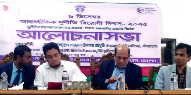 ভোলার দৌলতখানে যথাযোগ্য মর্যাদা ও নানা কর্মসূচির মাধ্যমে আন্তর্জাতিক দুর্নীতি বিরোধী দিবস পালিত হয়েছে। “দুর্নীতির বিরুদ্ধে তারুণ্যের একতা, গড়বে আগামীর শুদ্ধতা”— এই প্রতিপাদ্যকে সামনে রেখে মঙ্গলবার (৯ ডিসেম্বর ২০২৫) সকাল থেকে উপজেলা প্রশাসন ও উপজেলা দুর্নীতি প্রতিরোধ কমিটি যৌথভাবে দিনব্যাপী কর্মসূচি গ্রহণ করে।
