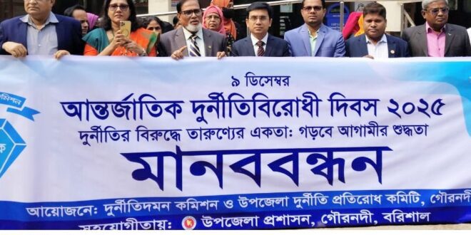 আন্তর্জাতিক দুর্নীতিবিরোধী দিবস উপলক্ষে দুর্নীতি দমন কমিশন ও গৌরনদী উপজেলা দুর্নীতি প্রতিরোধ কমিটির উদ্যোগে মানববন্ধন র্যা লী আলোচনা সভা অনুষ্ঠিত হয়।