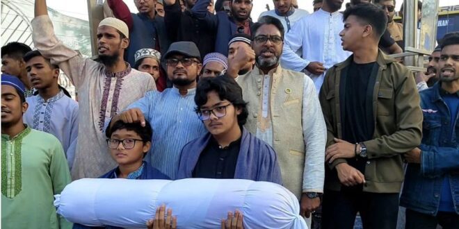 ইনকিলাব মঞ্চের মুখপাত্র শরীফ ওসমান হাদিকে গুলি করে হত্যার প্রতিবাদে ও এর সঙ্গে জড়িতদের বিচারের দাবিতে কফিন মিছিল করেছে পিরোজপুরের ছাত্র জনতা। শুক্রবার বিকেল সাড়ে ৩ টার দিকে শহরের কেন্দ্রীয় শহীদ মিনার চত্বরে অবস্থিত জুলাই স্মৃতিস্তম্ভ থেকে কফিন মিছিলটি শুরু হয়। মিছিলটি শহরের গুরুত্বপূর্ণ সড়ক প্রদক্ষিণ শেষে সিও অফিস চত্বরে প্রতিবাদ সমাবেশে মিলিত হন। এ সময় ছাত্র জনতা নানা স্লোগান দেন।