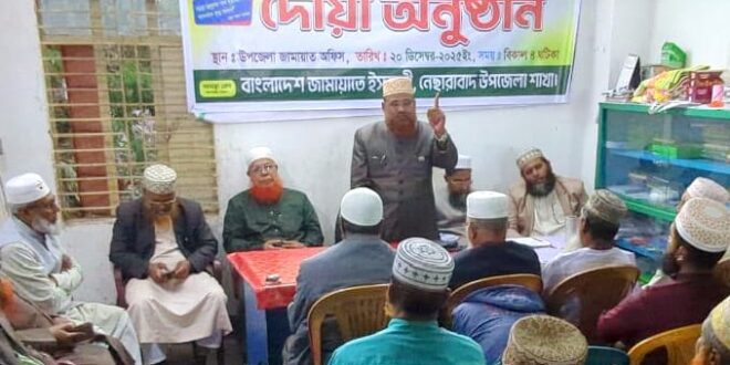 নেছারাবাদে ইনকিলাব মঞ্চের মুখপাত্র জুলাই যোদ্ধা শরীফ ওসমান হাদীর রুহের মাগফিরাত কামনায় উপজেলা জামায়াতের দোয়া অনুষ্ঠান অনুষ্ঠিত হয়েছে। দলের কেন্দ্রীয় কর্মসূচির অংশ হিসেবে শনিবার নেছারাবাদ উপজেলা কার্যালয়ে এ দোয়া অনুষ্ঠিত হয়। কুরআন তিলাওয়াত করেন বাইতুল মাল সেক্রেটারি মাওলানা মো নিজাম উদ্দিন।