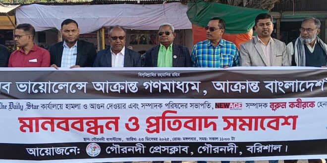 মঙ্গলবার (২৩ডিসেম্বর) সকাল ১১টায় গৌরনদী বাসস্ট্যান্ড এলাকায় গৌরনদী প্রেসক্লাবের আয়োজনে এই মানববন্ধন ও প্রতিবাদ সমাবেশ অনুষ্ঠিত হয়। মানববন্ধনে গৌরনদী প্রেসক্লাবের আহ্বায়ক সিনিয়র সাংবাদিক জহুরুল ইসলাম জহির–এর সভাপতিত্বে বক্তব্য রাখেন প্রেসক্লাবের প্যানেল আহ্বায়ক মো. গিয়াস উদ্দিন মিয়া, খন্দকার মনিরুজ্জামান মনির, প্রেসক্লাবের সাবেক সাধারণ সম্পাদক মো. খোকন আহমেদ হীরা, সাবেক সভাপতি আসাদুজ্জামান রিপন, সদস্য মোল্লা ফারুক, কাজী আলআমিন সহ অন্যান্য সাংবাদিক নেতৃবৃন্দ।