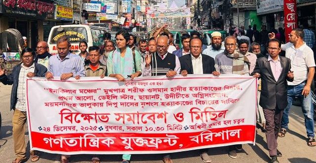 গণতন্ত্রের পথে বাঁধা সৃষ্টি ও নির্বাচন বানচালের চক্রান্ত প্রতিহত করা, সব রাজনৈতিক হত্যার বিচার করা, খুন, মব সন্ত্রাস, সংবাদপত্র এবং সাংস্কৃতিক সংগঠনের উপর হামলার বিচার এবং উগ্র সাম্প্রদায়িক গোষ্ঠীর আগ্রাসন বন্ধের দাবিতে বরিশালে গণতান্ত্রিক যুক্ত ফ্রন্টের বিক্ষোভ সমাবেশ ও মিছিল অনুষ্ঠিত হয়েছে।