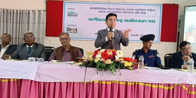 কমিউনিটিভিত্তিক বিরোধ নিষ্পত্তির মাধ্যমে ন্যায়বিচারে জনগণের প্রবেশাধিকার নিশ্চিত করার লক্ষ্যে গৌরনদীতে অনুষ্ঠিত হয়েছে অংশীজনদের প্রকল্প অবহিতকরণ সভা। বুধবার (২৪ ডিসেম্বর) সকাল ১১ টায় গৌরনদী উপজেলা পরিষদ মিলনায়তনে এ সভা অনুষ্ঠিত হয়। নাগরিক উদ্যোগ (Citizen’s Initiative) বাস্তবায়িত এবং আন্তর্জাতিক সংস্থা Brot für die Welt-এর সহযোগিতায় আয়োজিত এ সভায় বিভিন্ন শ্রেণি-পেশার প্রতিনিধিরা অংশগ্রহণ করেন।