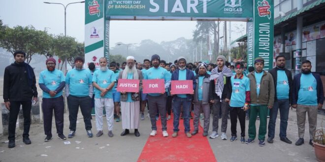 বাংলাদেশের মহান বিজয় দিবসের ৫৫তম বর্ষপূর্তি উপলক্ষে শুক্রবার সকাল সাড়ে ৬টায় ভিক্টোরি রান উইথ ইনকিলাব ম্যারাথন অনুষ্ঠিত হয়েছে। শের-ই-বাংলা মেডিকেল কলেজের শিক্ষার্থীদের সংগঠন ইনকিলাব শিক্ষা ও সাংস্কৃতিক সংসদ-এর উদ্যোগে এই বর্ণাঢ্য ম্যারাথনের আয়োজন করা হয়। ‘Run for Health, Run for Victory’ শিরোনামে অনুষ্ঠিত এই ম্যারাথনে বরিশালের অন্তত পাঁচ শতাধিক ছাত্র-জনতা স্বতঃস্ফূর্তভাবে অংশগ্রহণ করেন।