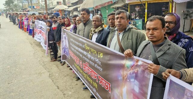 মানববন্ধনে বক্তারা সরকারের কাছে পোশাক শ্রমিক দীপু চন্দ্র দাসকে নৃশংসভাবে হত্যা কারীদের দ্রæত সময়ের মধ্যে দৃষ্টান্তমূলক বিচার দাবী করেন।