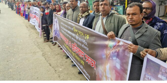 ময়মনসিংহের ভালুকায় পোশাক শ্রমিক দীপু চন্দ্র দাসকে আগুনে পুড়িয়ে নৃশংসভাবে হত্যাকারীদের দৃষ্টান্তমূলক বিচারের দাবীতে বরিশালের গৌরনদীতে মানববন্ধন ও সমাবেশ অনুষ্ঠিত হয়েছে।