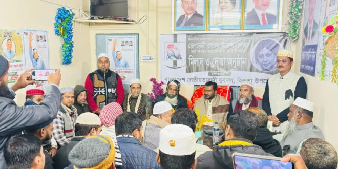 ০৪জানুয়ারি রবিবার বিকাল চারটায় উপজেলা সদরে যুবদলের প্রধান কার্যালয়ে এ দোয়া ও মিলাদ মাহফিল আয়োজন করা হয়। দোয়া ও মিলাদ মাহফিলে হিজলা উপজেলা বিএনপি, অঙ্গ ও সহযোগী সংগঠনের নেতাকর্মী ও সাধারণ জনগণ অংশগ্রহণ করেন।
