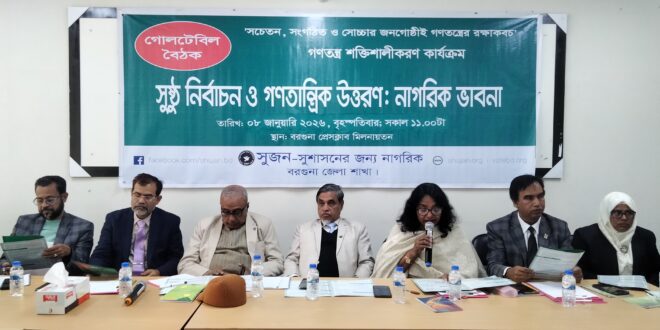 বৃহস্পতিবার (৮ জানুয়ারি) বিকেল তিনটায় বরগুনা প্রেসক্লাব মিলনায়তনে ‘গণতন্ত্র শক্তিশালীকরণ কার্যক্রম: সুষ্ঠু নির্বাচন ও গণতান্ত্রিক উত্তরণ-নাগরিক ভাবনা’ শীর্ষক গোলটেবিল বৈঠক অনুষ্ঠিত হয়। সভায় সভাপতিত্ব করেন সুজন-সুশাসনের জন্য নাগরিক বরগুনা জেলা কমিটির সভাপতি অধ্যক্ষ জিয়াউল করিম।