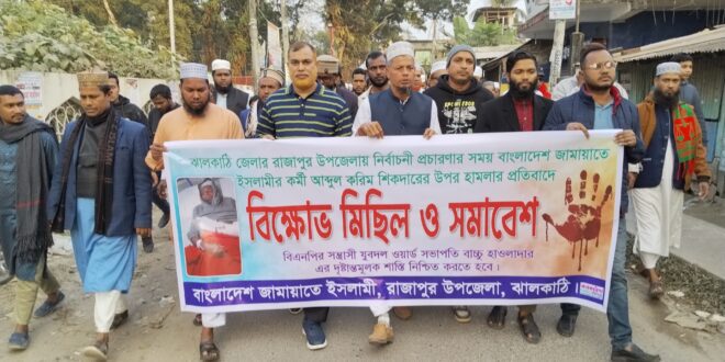 বুলবুল আহমেদ, রাজাপুর : ঝালকাঠি জেলার রাজাপুর উপজেলায় বাংলাদেশ জামায়াতে ইসলামীর কর্মী করিম সিকদার এর উপর যুবদল নেতার হামলার প্রতিবাদে বিক্ষোভ মিছিল ও সমাবেশ অনুষ্ঠিত হয়েছে।