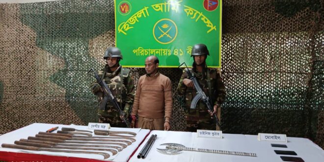 সেনাবাহিনী সূত্রে জানা গেছে,৭ পদাতিক ডিভিশনের অধীনস্থ ৪১ বীর-এর একটি দল মাদক ও অবৈধ অস্ত্র উদ্ধারে নিয়মিত অভিযানের অংশ হিসেবে এই কার্যক্রম চালায়।৪১ বীর-এর অধিনায়ক মেজর কাজী জাহিদুল ইসলামের নেতৃত্বে ৬০ জন সেনাসদস্যের একটি দল রাত ৩টার দিকে হিজলার চর কুশুরিয়া এলাকায় তল্লাশি শুরু করে।বিপুল পরিমাণ দেশীয় অস্ত্রসহ মোস্তফা সিকদার (৫০) নামে এক ব্যক্তিকে আটক করা হয়।