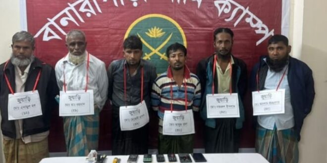 আটককৃতরা হলেন— বিশারকান্দি ইউনিয়নের উমারেরপাড় ৭ নম্বর ওয়ার্ডের এনামুল হক (৬২), মলুহার ৯ নম্বর ওয়ার্ডের আব্দুর রহমান (৫৯) ও মেহেদী হাসান (৩৯), উমারেরপাড় ৮ নম্বর ওয়ার্ডের মাসুম রানা (৩০), নজরুল ইসলাম (৪০) এবং ছালাম হাওলাদার (৪৫)।