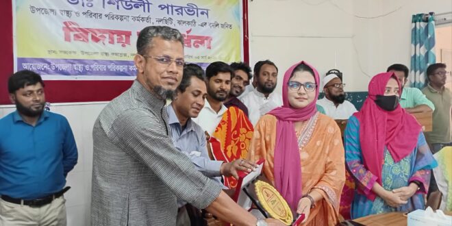 ঝালকাঠির নলছিটিতে উপজেলা স্বাস্থ্য ও পরিবার পরিকল্পনা কর্মকর্তা ডা. শিউলি পারভীনের বিদায় সংবর্ধনা অনুষ্ঠিত হয়েছে। বৃহস্পতিবার (৫ মার্চ) দুপুরে নলছিটি উপজেলা স্বাস্থ্য কমপ্লেক্সের সভাকক্ষে উপজেলা স্বাস্থ্য ও পরিবার পরিকল্পনা কার্যালয়ের আয়োজনে এ সংবর্ধনা অনুষ্ঠান অনুষ্ঠিত হয়।