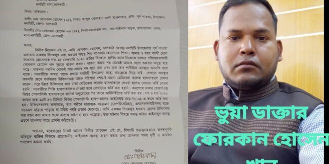 ঝালকাঠির নলছিটিতে নিজেকে ভুয়া ডিএমএফ ডাক্তার দাবি করা ন্যশনাল পিপলস পার্টির কেন্দ্রিয় সদস্য এবং ত্রয়োদশ জাতীয় সংসদ নির্বাচনে ঝালকাঠি-২ আসনের এনপিপি`র মনোনীত সংসদ সদস্য প্রার্থী মোঃ ফোরকান হোসেন খানের বিরুদ্ধে নলছিটি থানায় লিখিত অভিযোগ দায়ের করেছেন ভুক্তভোগী।