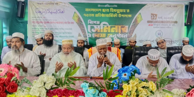 “আল্লাহওয়ালাদের দল হবেই সফল” -এই প্রতিপাদ্যকে সামনে রেখে বাংলাদেশ ছাত্র হিযবুল্লাহ’র ৭৫তম প্রতিষ্ঠাবার্ষিকী উপলক্ষে বিশেষ সেমিনার ও দোয়া অনুষ্ঠিত হয়েছে। বুধবার (১১ মার্চ) সকালে বাংলাদেশ ছাত্র হিযবুল্লাহ কেন্দ্রীয় কমিটির উদ্যোগে ছারছীনা দরবার শরীফের হিযবুল্লাহ কমপ্লেক্সের তৃতীয় তলায় এ সেমিনার অনুষ্ঠিত হয়। বাংলাদেশ ছাত্র হিযবুল্লাহ কেন্দ্রীয় কমিটির সভাপতি মোহাম্মদ আবু ওয়াক্কাসের সভাপতিত্বে অনুষ্ঠিত সেমিনারে প্রধান অতিথি হিসেবে উপস্থিত ছিলেন বাংলাদেশ জমইয়াতে হিযবুল্লাহর কেন্দ্রীয় নাজেমে আ’লা ড. সৈয়দ মুহাঃ শরাফত আলী ।