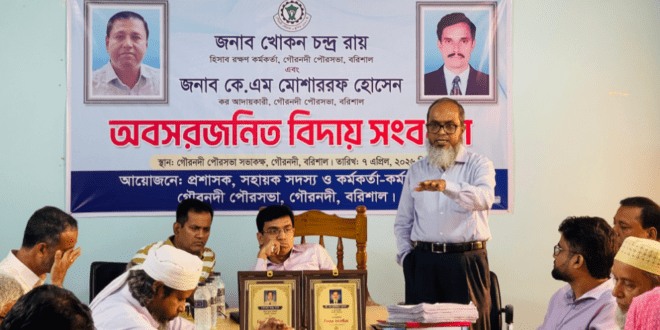 বরিশালের গৌরনদী পৌরসভায় অবসরজনিত বিদায় সংবর্ধনা অনুষ্ঠান অনুষ্ঠিত হয়েছে। সোমবার (৭ এপ্রিল ২০২৬) পৌরসভা সভাকক্ষে আয়োজিত এ অনুষ্ঠানে দীর্ঘদিনের সেবার স্বীকৃতি হিসেবে হিসাব রক্ষণ কর্মকর্তা জনাব খোকন চন্দ্র রায় এবং কর আদায়কারী জনাব কে. এম মোশাররফ হোসেনকে সংবর্ধনা জানানো হয়।