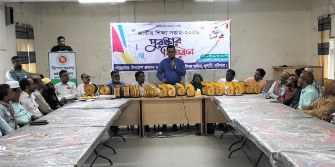 বরিশালের মুলাদী উপজেলায় গতকাল ৮ এপ্রিল বুধবার সকাল ১০টায় উপজেলা হলরুমে উপজেলা প্রশাসন ও উপজেলা মাধ্যমিক শিক্ষা অফিসের আয়োজনে জাতীয় শিক্ষা সপ্তাহ-২০২৬ পুরস্কার বিতরণ অনুষ্ঠানে উপজেলা মাধ্যমিক শিক্ষা কর্মকর্তা নাসরিন জোবাইদা আক্তারের সভাপতিত্বে প্রধান অতিথি ছিলেন উপজেলা নির্বাহী কর্মকর্তা মো: গোলাম সরওয়ার।