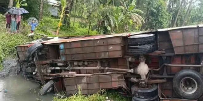 ভোলায় একটি যাত্রীবাহী বাস সাইড দিতে গিয়ে নিয়ন্ত্রণ হারিয়ে রাস্তার পাশে খালে পড়ে গেছে। এ ঘটনায় বাসের যাত্রী ও চালকসহ অন্তত ১০-১২ জন আহত হয়েছেন। আহতের মধ্যে ৫ জনকে বোরহানউদ্দিন উপজেলা স্বাস্থ্য কমপ্লেক্সে ভর্তি করা হয়েছে ও বাকিরা স্থানীয়ভাবে ফার্মেসিতে চিকিৎসা নিয়েছেন। বৃহস্পতিবার (৯ এপ্রিল) সকাল ৯টার দিকে ভোলার বোরহানউদ্দিন কেরামতগঞ্জ বাজার এলাকার ভোলা-চরফ্যাশন সড়কে এ ঘটনা ঘটে।